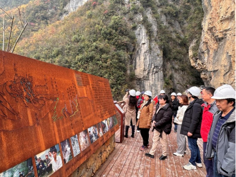 首先,大家来到了“天路”的起点,讲解员为我们讲述了下庄村当年四周高山绝壁合围、生存环境恶劣、生活条件艰苦,越来越多的人选择搬出了村子。村支书毛相林眼见村子即将消亡殆尽,决定带领村民开凿出山之路。但物资匮乏,设备稀缺,他们被迫用肩挑背扛这种传统方式,历经7年,以牺牲6人的代价修通了这条全长8公里的绝壁“天路”,下庄从此与外界相连。
